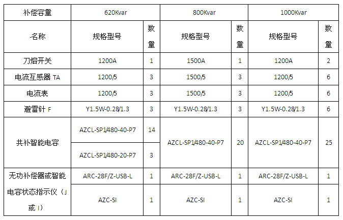 變壓器容量為400/800/1000/1250/1600/2000KVA的三相補償應用方案(串接7%電抗器)