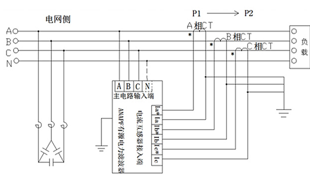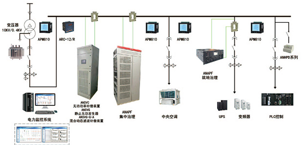 ANAPF系列有源電力濾波器通過電流互感器采集系統諧波電流,經控制器快速計算并提取各次諧波電流的含量,產生諧波電流指令,通過功率執行器件產生與諧波電流幅值相等方向相反的補償電流,并注入電力系統中,從而抵消非線性負載所產生的諧波電流。