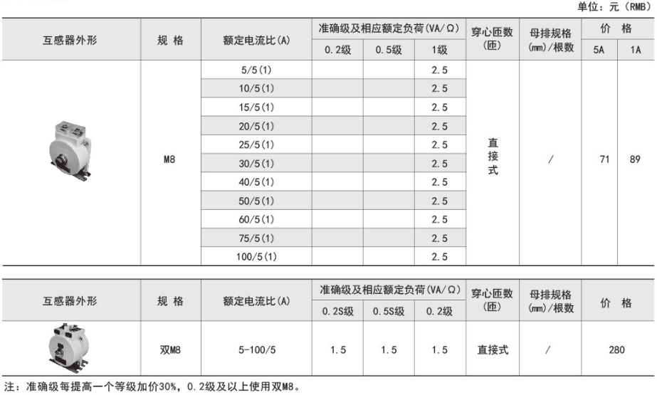 技術要求:額定電流比100A/5A; 準確級1級; 穿心匝數1匝;額定負荷1.5VA;內孔徑φ22mm;穿排規格30mm x 10mm 1根。